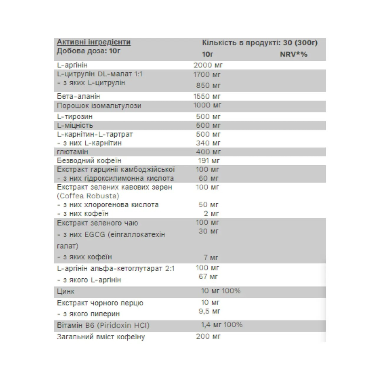 Інгредієнти: L-аргінін, L-цитрулін DL-малат 1:1, бета-аланін, порошок ізомальтулози+, L-тирозин, L-таурин, L-карнітин L-тартрат, ароматизатор, L-глютамін, регулятор кислотності (безводна лимонна кислота). ), підсолоджувачі (ацесульфам К, сукралоза), безводний кофеїн, засіб, що запобігає злежуванню (діоксид кремнію, трикальцій фосфат), гарцинія камбоджійська. (фруктова шкірка) екстракт [хв. з 60% вмістом гідроксилимонної кислоти], Coffea Robusta L. (кавове зерно) 12:1 екстракт [мін. 50% хлорогенова кислота, макс. 2% кофеїну], екстракт Camellia Sinensis (листя) [макс. 30% епігалокатехінгалат, макс. 7% кофеїну], L-аргінін-альфа-кетоглутарат 2:1, барвники (каротини), оксид цинку, Piper Nigrum (фрукти) 50:1 екстракт [хв. 95% піперину], вітамін B6 (піридоксин HCI). +Ізомальтулоза є джерелом глюкози і фруктози.